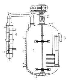 1- Agitador 2 - Motor do agitador 3 - Sistema de aquecimento 4 - Condensador para a água |