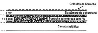 Quadras esportivas (Figura 7. 4) podem ser recobertas diretamente sobre a camada asfáltica, usando-se os grânulos classificados de borracha recobertos com um prepolímero curado com umidade do ar. A superfície porosa é normalmente recoberta, com um verniz de PU flexível e pigmentado ou, com um revestimento de 3 a 4 mm de espessura de um elastômero de PU pigmentado aplicado por spray. A espessura do revestimento depende do grau de resistência às intempéries desejada.