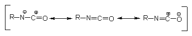 The manufacture of PU's began as a chemists' empirical task, however the pioneers in this field tried to explain the scientific secrets of this research area. Now, looking at the past it is clear that many discoveries have been put forward since Otto Bayer's original work. However there is still a lot of evidence of empirical character in the chemistry of PU's. The observation of the isocyanate group electronic structure indicates that the resonance structures in Figure 1.5 are possible. The electron density is smaller in the carbon atom, average in nitrogen and larger in oxygen. Isocyanate reactions mainly occur through addition to C=N double bond. An active hydrogen atom-containing nucleophilic center attacks the electrophilic carbon atom and active hydrogen is added to the nitrogen atom. NCO-bonded electron acceptor groups increase the reactivity and donor groups reduce it. For that reason, aromatic isocyanates are more reactive than aliphatic ones. Reactivity is reduced by steric hindrance in isocyanate groups, and also in active hydrogen compounds.