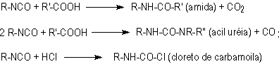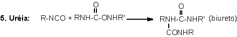 The hydrogen of urethane and urea groups can react with NCO, forming allophanate and biuret cross-linking groups. These reactions are reversible and occur at temperatures above 110oC, and when not catalyzed, are slow and very slow, respectively (Table 1.3). They mainly occur during the PU's post cure, where these are kept for a long time at high temperatures (22 hours at 70°C), or days at room temperature, depending on the system.