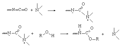 Since Otto Bayer's pioneering work, the catalysis mechanism of isocyanates reactions with alcohols (gel reaction) or with water (blow reaction) was studied by several authors and especially by Baker and Farkas. Baker postulated the formation of a complex consisting of an isocyanate and a tertiary amine catalyst, followed by the attack by nucleophilic reagents (water or alcohols) (Figure 2.2).